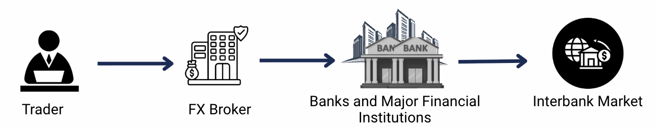 The interbank market is where banks and major financial institutions trade currencies directly with each other.