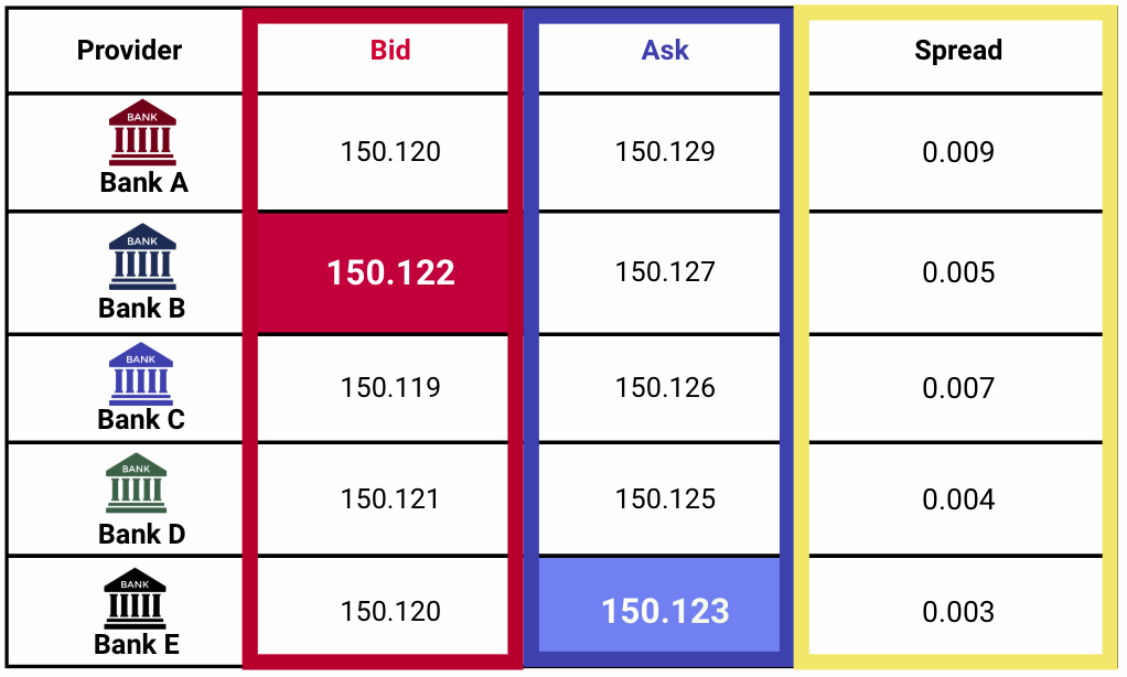 Best Bid / Best Ask: At any given moment, it represents the highest selling price (Bid) and the lowest buying price (Ask) available in the interbank market.