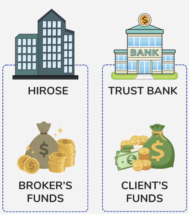 With trust preservation, your funds are completely separated from the Hirose broker’s money and managed by a licensed trust bank — a neutral third party.