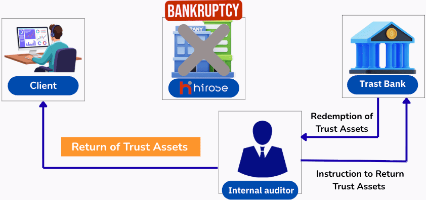 Client funds are completely separated from the broker’s operational funds and managed by a third-party trust bank. Even if the broker were to become insolvent, client funds are returned directly from the trust bank to the clients.