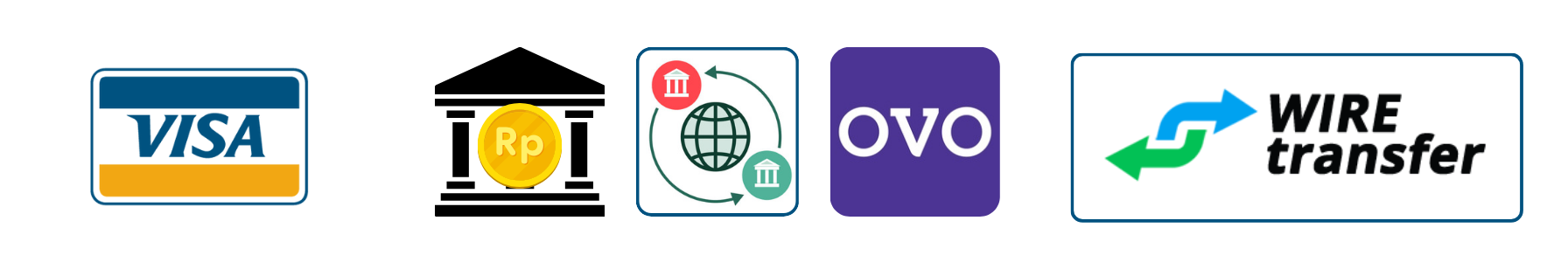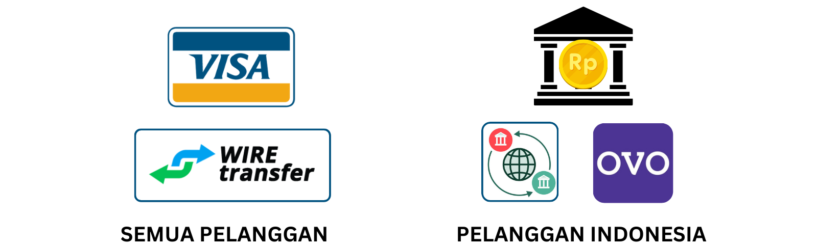 Untuk pelanggan di Indonesia: Selain VISA dan SWIFT, Anda dapat menggunakan Bank Lokal (Mandiri & BRI), Akun Virtual, dan Dompet Elektronik OVO.
