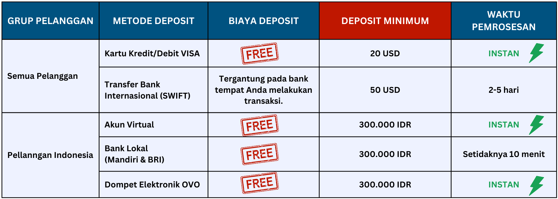 Untuk semua pelanggan: Deposit menggunakan Kartu Kredit/Debit VISA atau Transfer Bank Internasional (SWIFT).