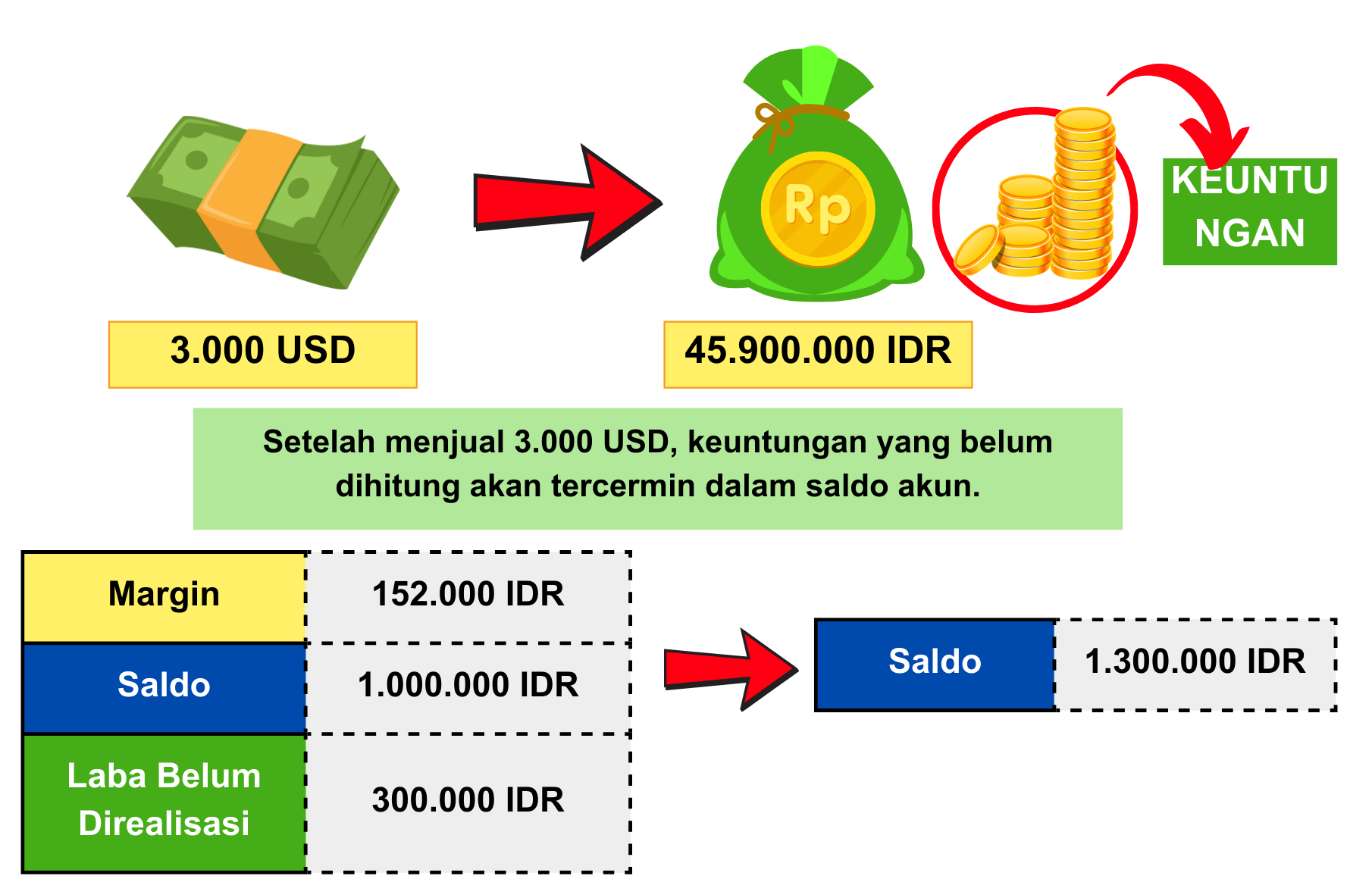 Setelah dia menjual 3.000 USD yang dia beli, keuntungan akan dihitung dan tercermin dalam akun tradingnya. saldo.