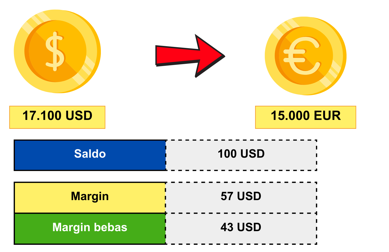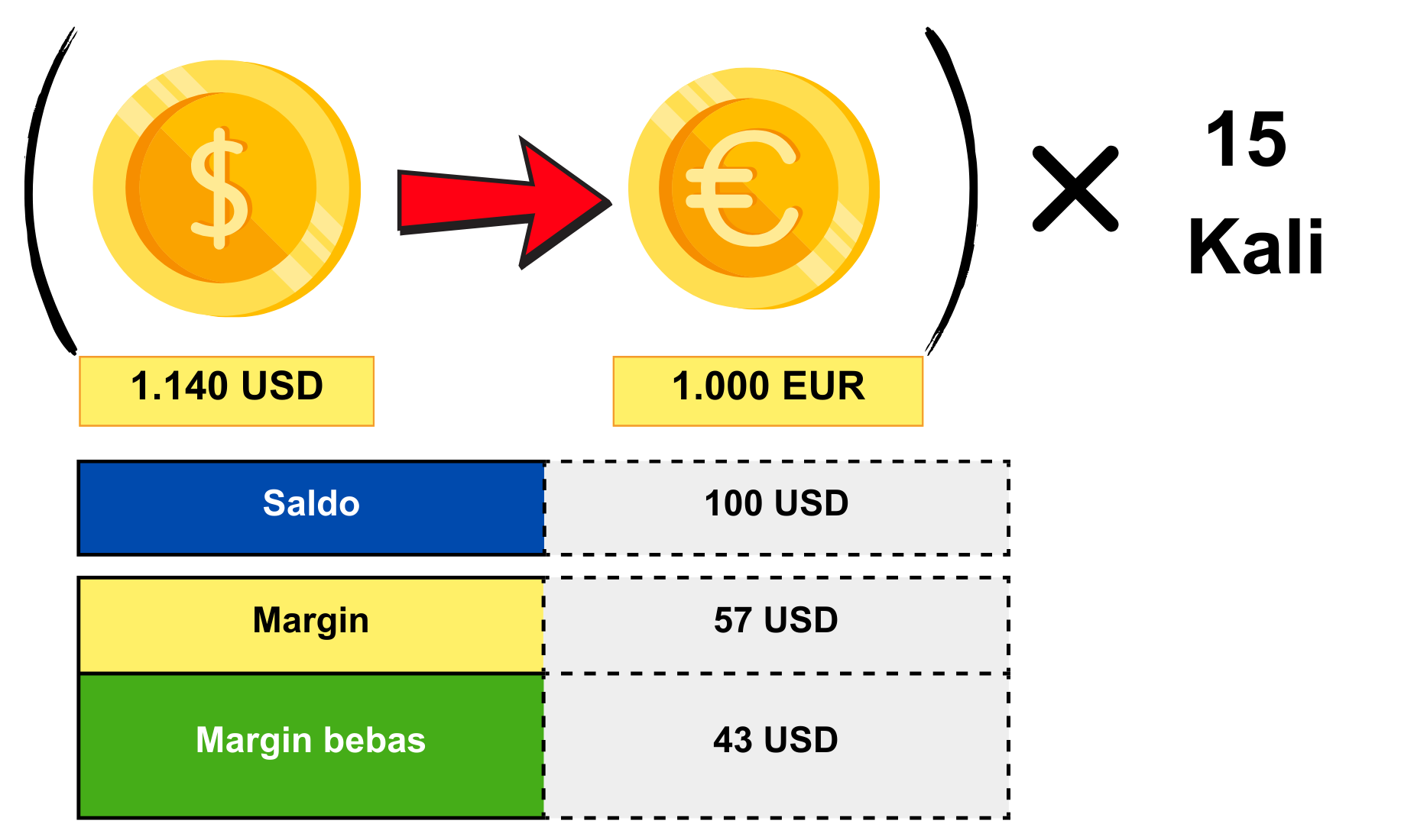 Margin yang digunakan adalah (1,14000 x 1.000 unit mata uang / 100) x 15 kali = 57 USD.