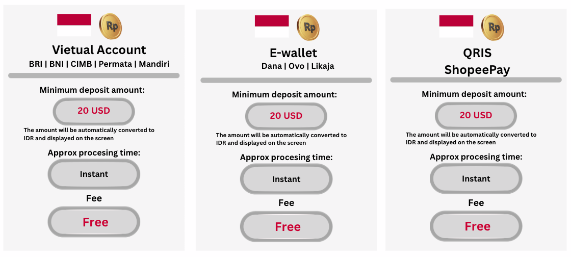 Jumlah deposit dalam Rupiah Indonesia (IDR) — yang dikonversi secara otomatis dari USD — akan ditampilkan.