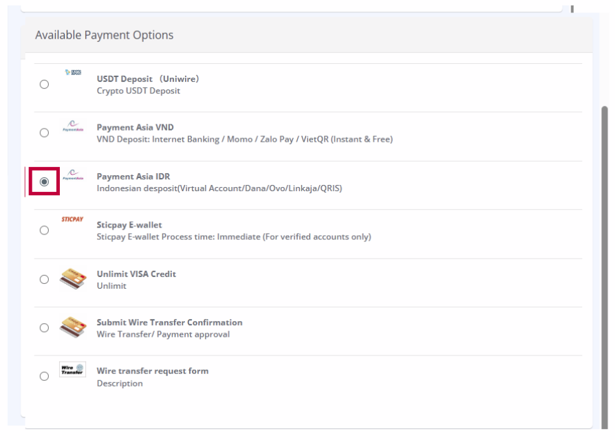 Di sisi kanan, di bawah [Available Payment Options], pilih [Payment Asia IDR].