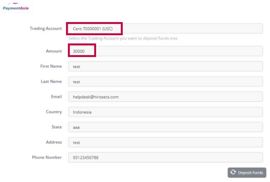 Pilih akun trading Anda, masukkan jumlah deposit, dan isi kolom lainnya yang diperlukan, kemudian klik [Deposit Funds].