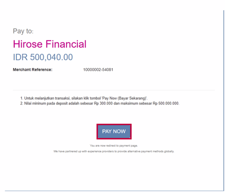 - Semua deposit harus berasal dari rekening bank dengan nama yang sama dengan akun trading Hirose Anda.
