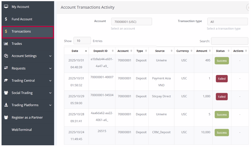 Anda dapat memeriksa hasil deposit Anda dari bagian [Transactions].