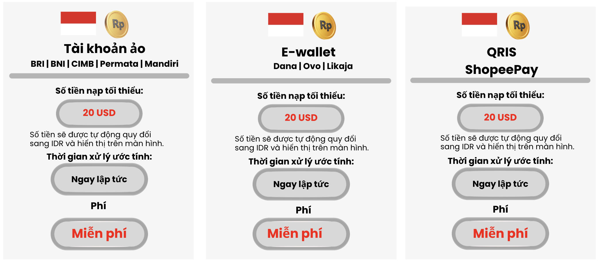 Số tiền nạp bằng Rupiah Indonesia (IDR) — được quy đổi tự động từ USD — sẽ được hiển thị.