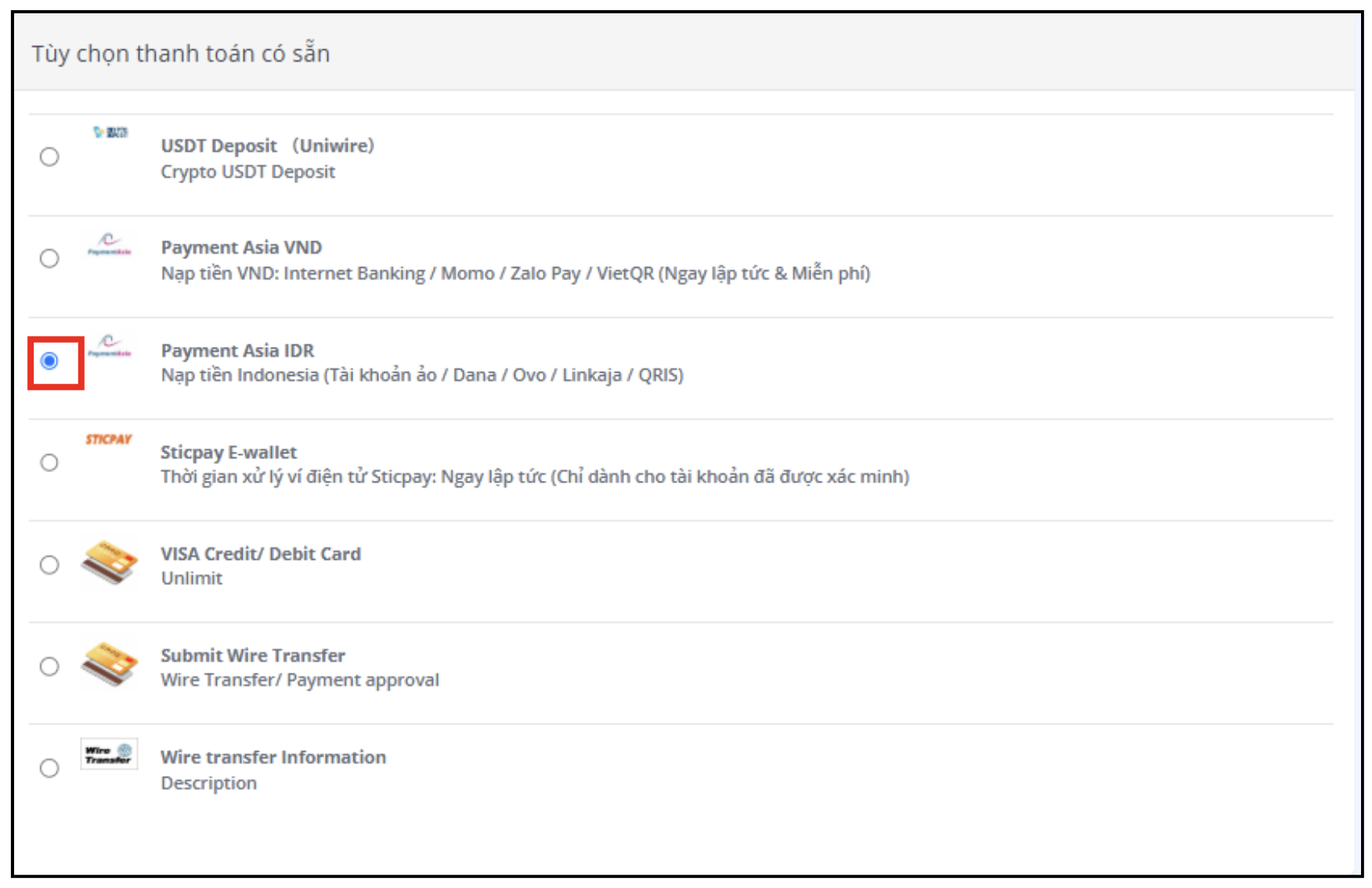 Ở phía bên phải, trong phần [Available Payment Options], chọn [Payment Asia IDR].