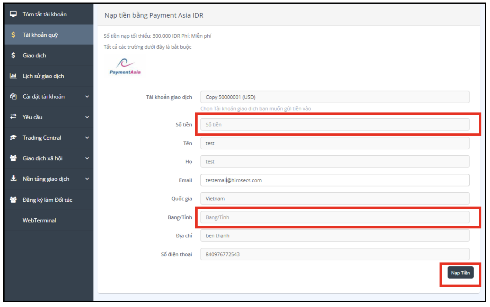 Chọn tài khoản giao dịch của bạn, nhập số tiền nạp và điền các thông tin cần thiết khác, sau đó nhấp [Deposit Funds].