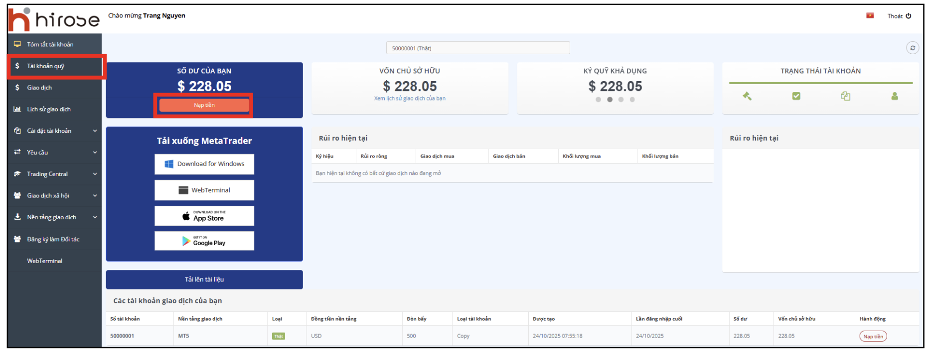 • Tất cả khoản nạp tiền phải được thực hiện từ tài khoản ngân hàng có cùng tên với tài khoản giao dịch Hirose của bạn.