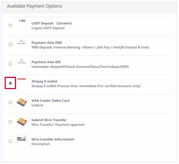 Di sisi kanan, di bawah [Available Payment Options], pilih [Sticpay E-wallet].