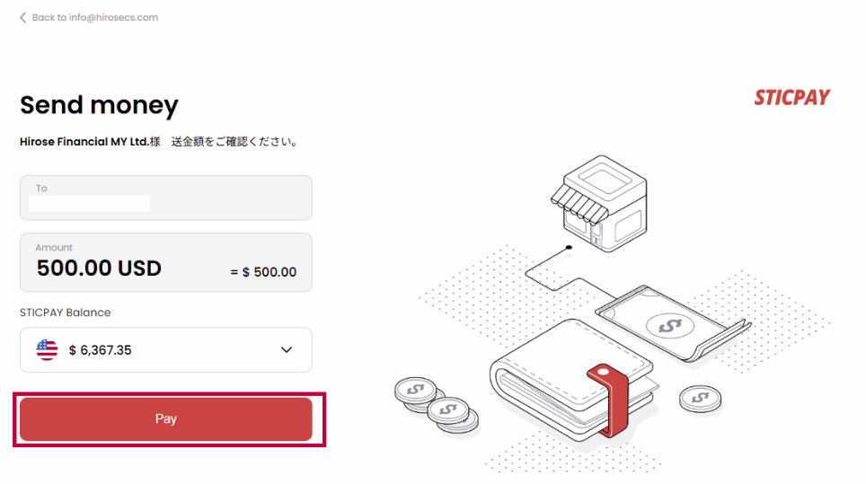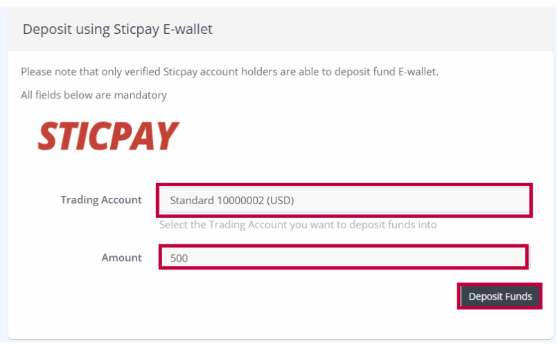 Setoran melalui STICPAY hanya diterima dari akun STICPAY yang terdaftar dengan nama yang sama seperti akun trading Hirose Anda. Setoran dari pihak ketiga sangat dilarang. Jika setoran dari pihak ketiga diterima, dana akan dikembalikan ke sumber asal dan semua biaya terkait akan menjadi tanggung jawab klien.