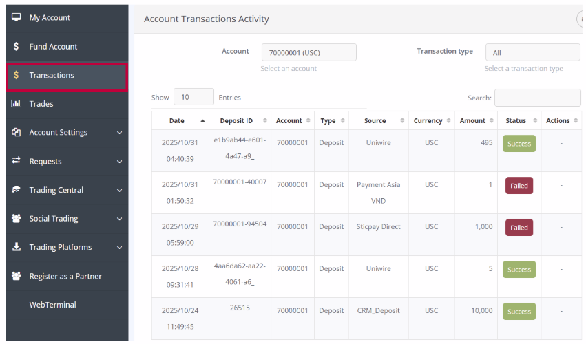 Anda dapat memeriksa hasil deposit Anda di bagian [Transactions].