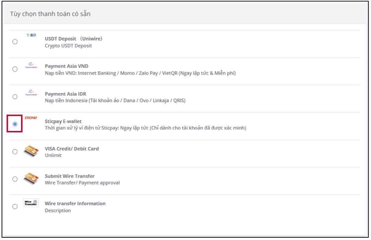 Ở phía bên phải, trong phần [Available Payment Options], chọn [Sticpay E-wallet].