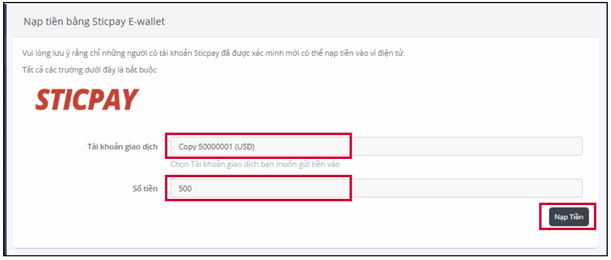 Các khoản nạp tiền thông qua STICPAY chỉ được chấp nhận từ tài khoản STICPAY được đăng ký dưới cùng tên với tài khoản giao dịch Hirose của bạn. Việc nạp tiền từ bên thứ ba nghiêm cấm tuyệt đối. Nếu phát hiện khoản nạp từ bên thứ ba, tiền sẽ được hoàn trả về nguồn gốc ban đầu và mọi chi phí liên quan sẽ do khách hàng chịu trách nhiệm.