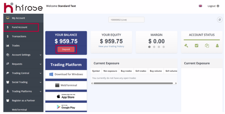Dari menu sebelah kiri, klik [Fund Account], atau klik tombol [Deposit] yang terletak di bawah saldo Anda.