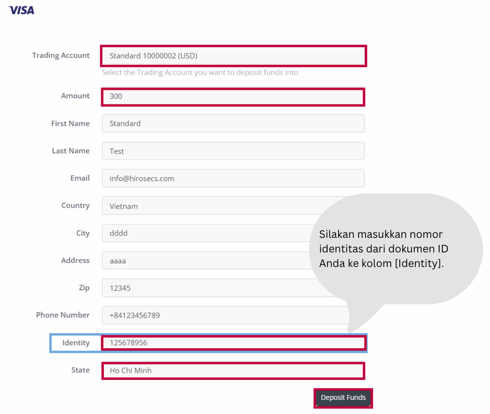 Pilih akun trading Anda, masukkan jumlah deposit, dan isi kolom lain yang diperlukan, lalu klik [Deposit Funds].