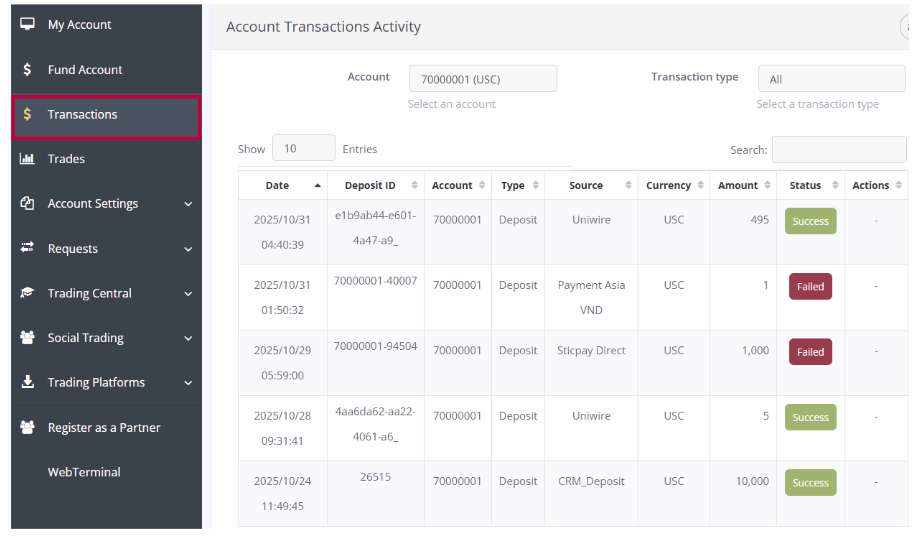 Anda dapat memeriksa hasil deposit Anda di bagian [Transactions].