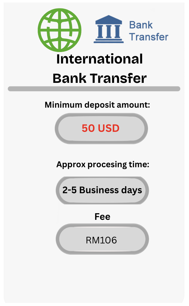 ✅ Deposit melalui International Bank Transfer akan dikreditkan setelah pembayaran diterima dan dikonfirmasi.
