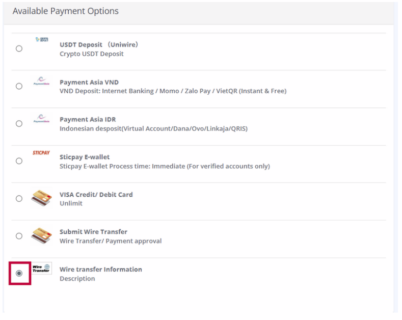 Di sisi kanan, pada bagian [Available Payment Options], pilih [Wire transfer information].