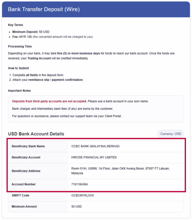 ✅ Harap diperhatikan bahwa Hirose tidak akan memproses deposit dari pihak ketiga. Pastikan bahwa setiap deposit yang dilakukan berasal dari rekening bank dengan nama yang sama dengan akun trading Anda di Hirose, bukan dari pihak ketiga. Jika deposit pihak ketiga dikreditkan ke akun Anda, dana tersebut akan dikembalikan ke sumber asal, dan Anda akan bertanggung jawab atas biaya yang mungkin timbul.