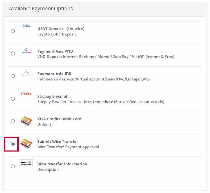 Di sisi kanan, pada bagian [Available Payment Options], pilih [Submit Wire Transfer].