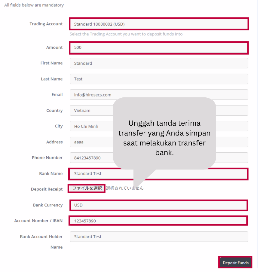 Pilih akun trading Anda, masukkan jumlah deposit, dan isi semua kolom yang diperlukan, lalu klik [Deposit Funds].