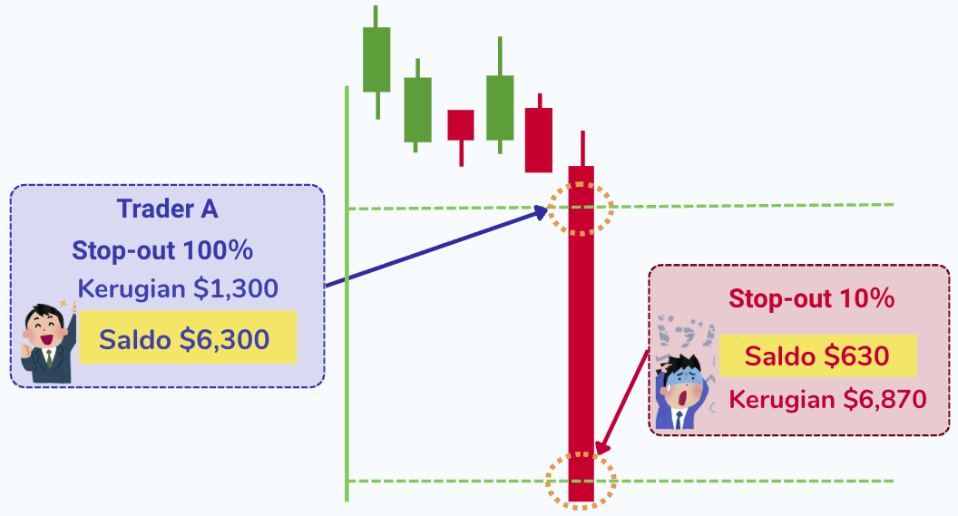 Baik stop-out ditetapkan pada 100% maupun 10%, stop-out tetap bisa terjadi—namun yang paling penting bukan hanya di mana stop-out terjadi, tetapi berapa banyak modal yang tersisa setelahnya.