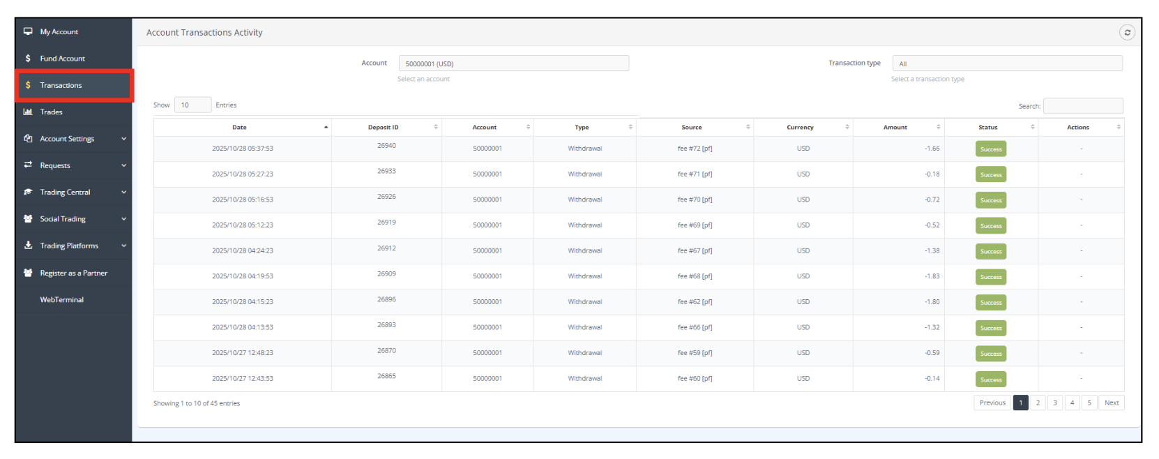 - Anda dapat memeriksa hasil penarikan dari bagian [Transactions]. Notifikasi juga akan dikirimkan ke alamat email terdaftar Anda.