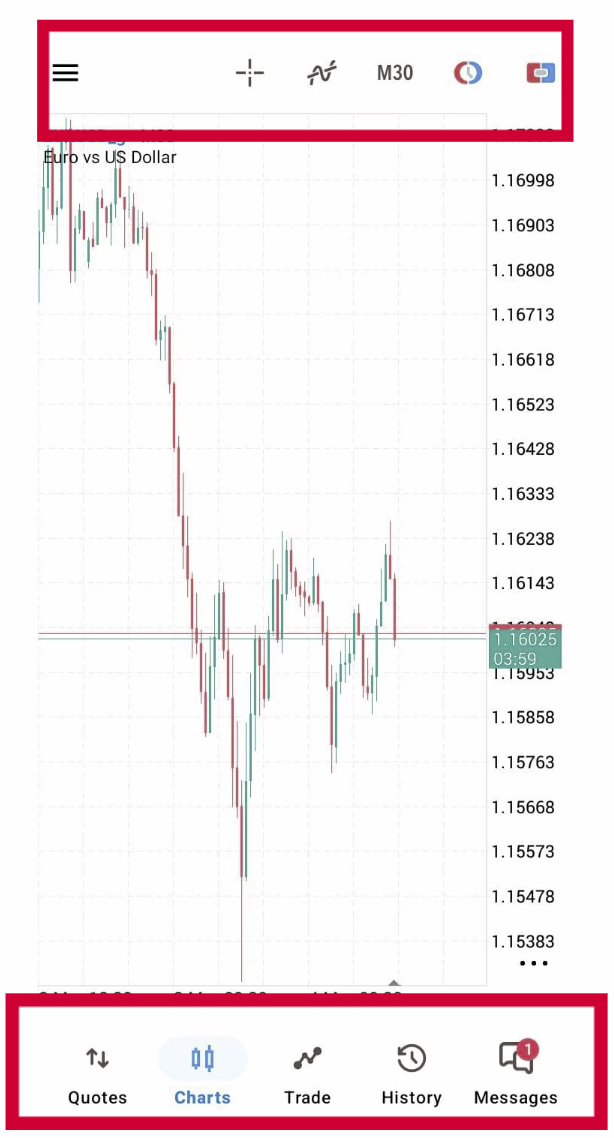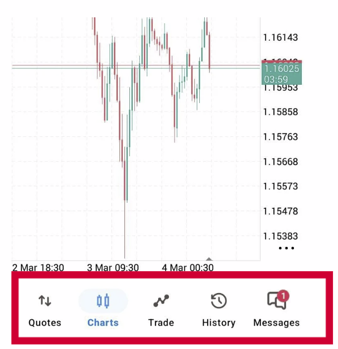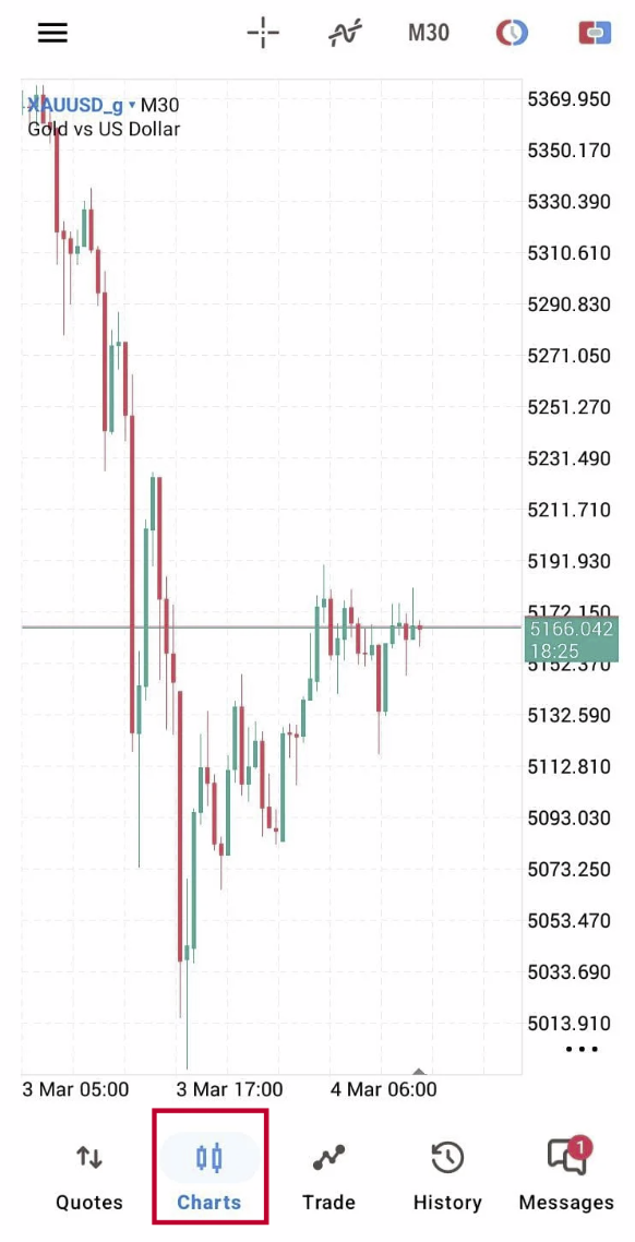 Grafik menampilkan perubahan harga dari waktu ke waktu. Anda dapat menerapkan berbagai indikator bawaan pada grafik untuk menganalisis pasar. Untuk beralih ke tab ini, gunakan menu di bagian bawah aplikasi MetaTrader 5.