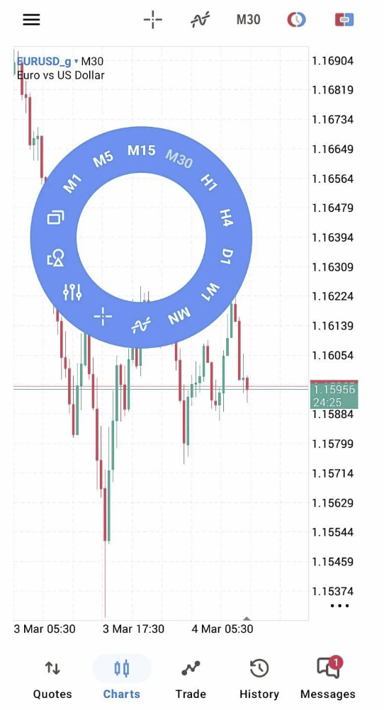 - Indikator – untuk mulai menggunakan indikator pada grafik, ketuk tombol di panel atas atau di menu radial.