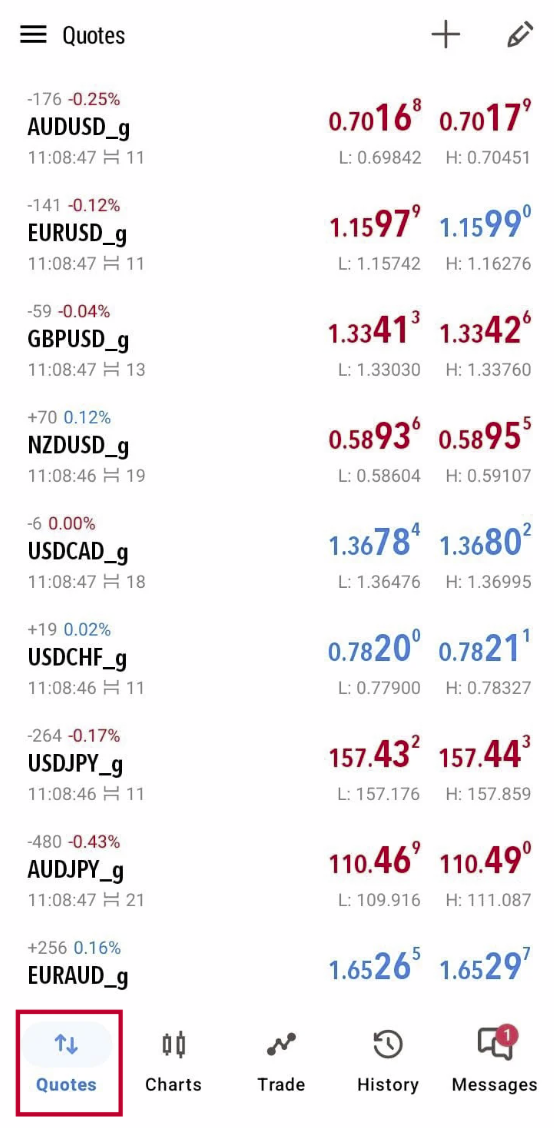 MT5 di Android beroperasi terutama melalui lima menu yang terletak di bagian bawah layar.