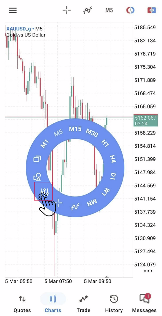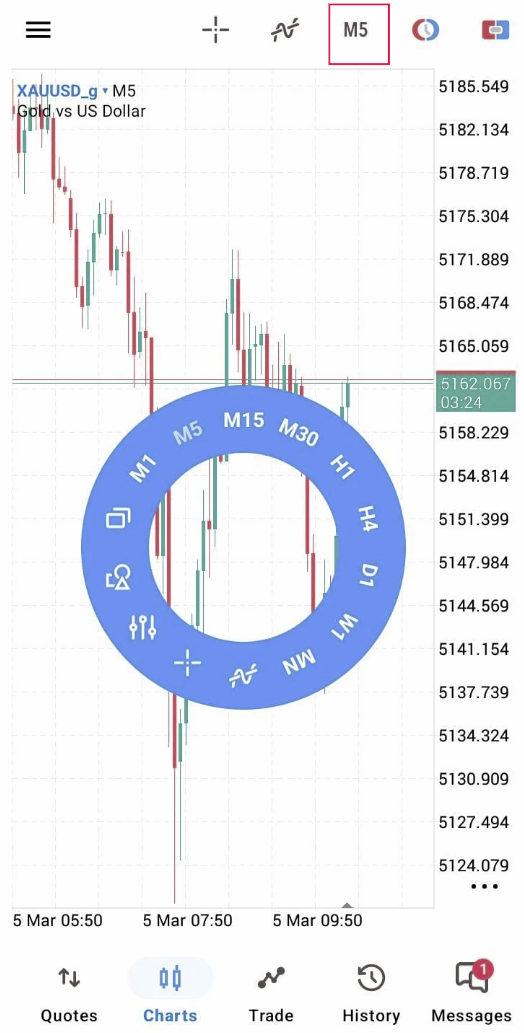 – Di bagian atas chart, ketuk tombol Timeframes dengan tulisan “M5”.
