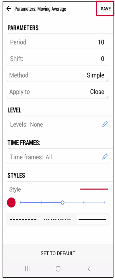 - • Tap the indicator you want to use (e.g., Moving Average, MACD, RSI).