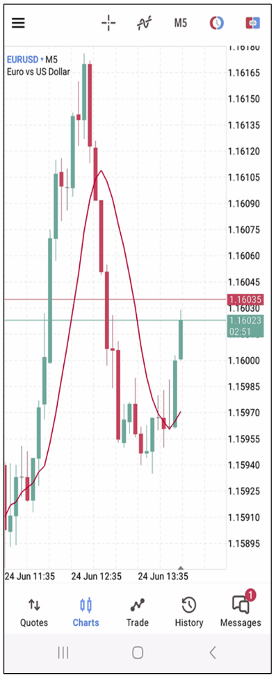 Indicators help analyze market behavior by visualizing price trends, momentum, and volatility directly on the chart. MT5 for Android allows you to add both main chart indicators (e.g., Moving Average) and separate window indicators (e.g., RSI, MACD).