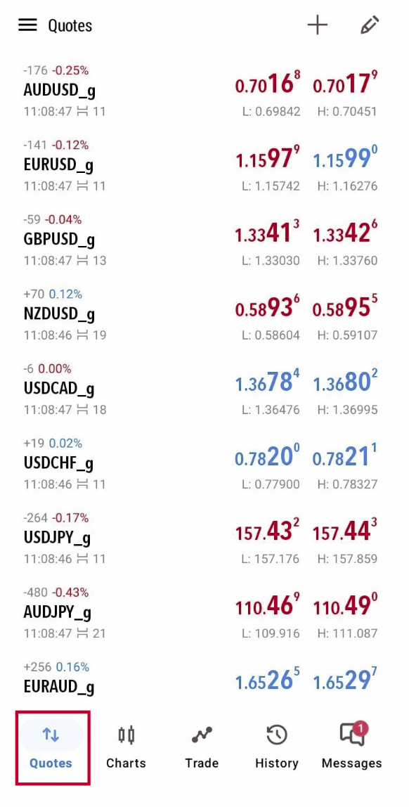 MT5 trên Android chủ yếu hoạt động thông qua năm menu nằm ở cuối màn hình.