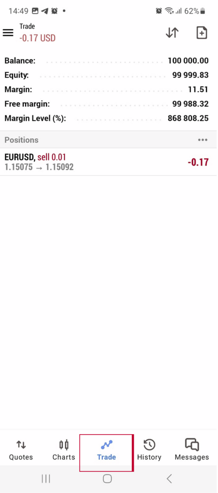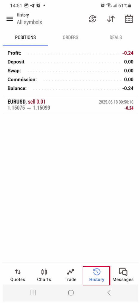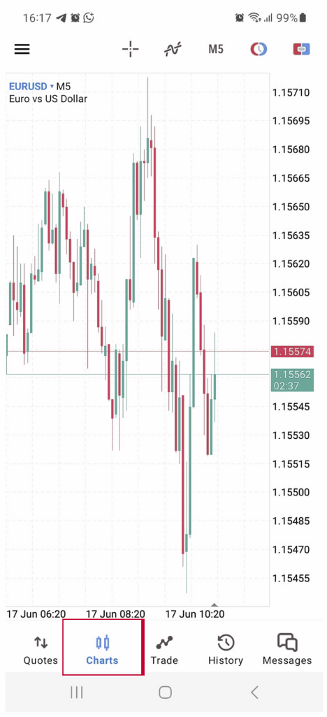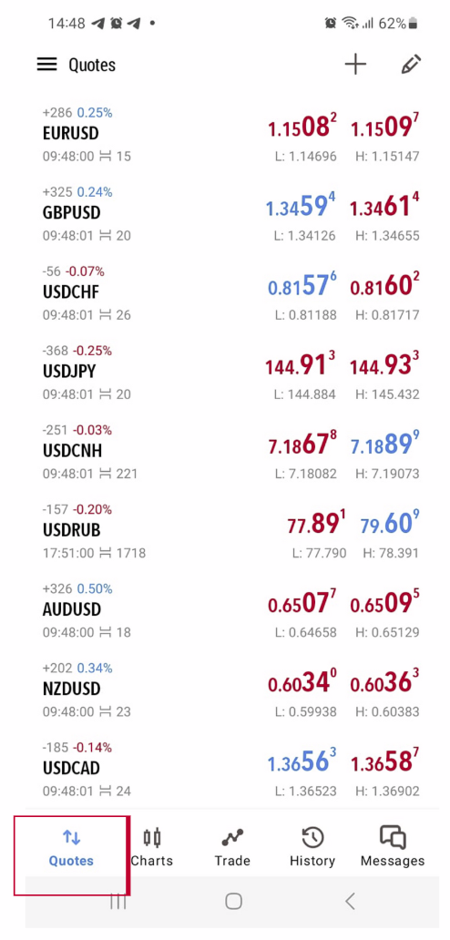 When you open the MT5 app on Android, you’ll see several main tabs at the bottom: