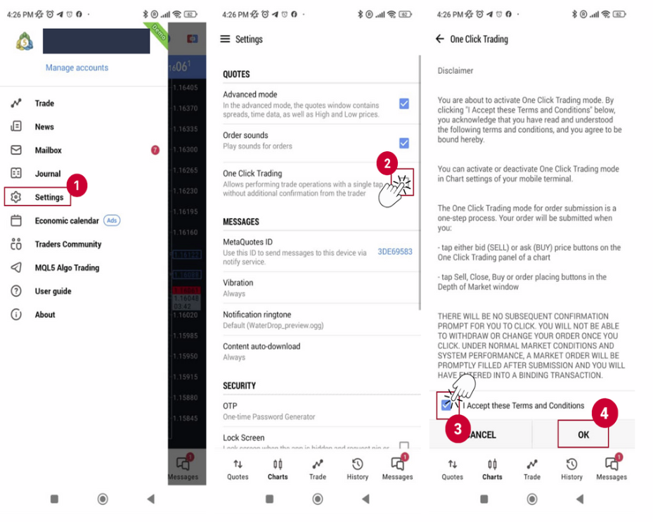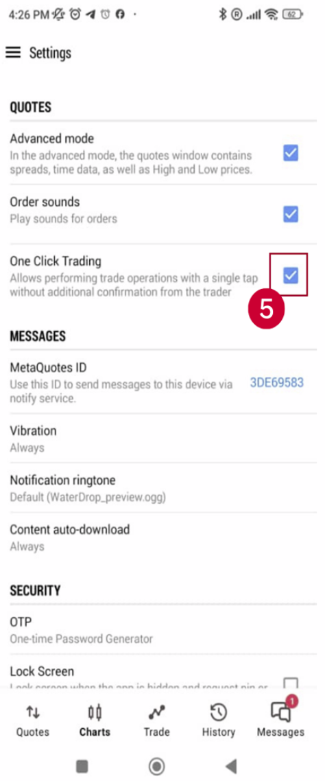 (2) On the Settings screen, check the box for ‘One-Click Trading’.