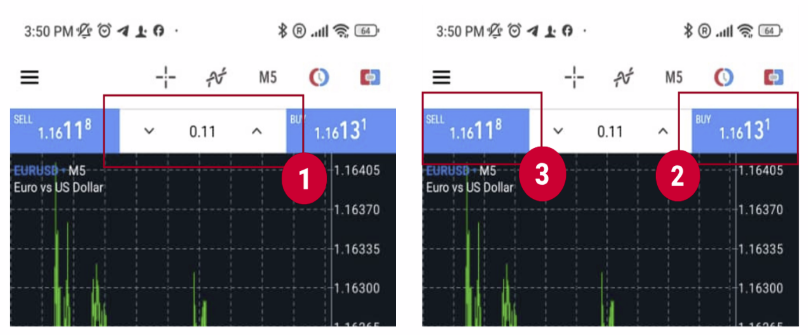 Enter the lot size in the upper center (1), and click (2) ‘BUY’ or (3) ‘SELL’ to place the order.