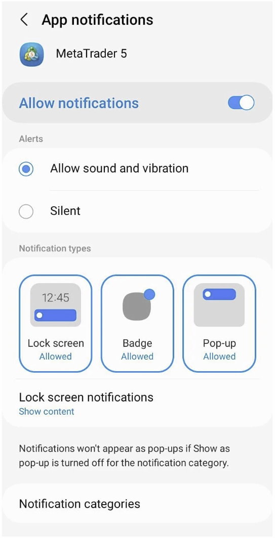 - – Go to Phone Settings → Apps → MT5 → Notifications