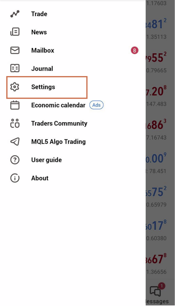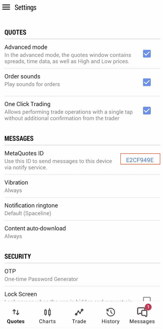1. In the same Settings menu, scroll down to find your MetaQuotes ID.