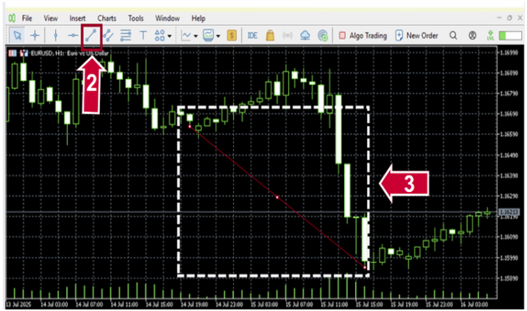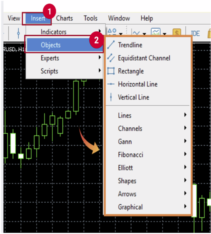 Nhấp vào công cụ bạn muốn sử dụng (ví dụ, đường xu hướng) từ Thanh Công Cụ Đối Tượng.