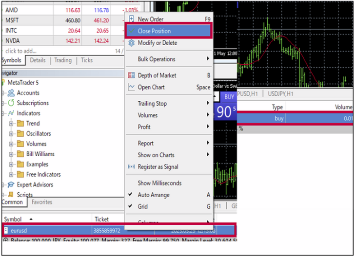 Hoặc nhấp chuột phải vào vị thế và chọn “Close Position” từ menu ngữ cảnh.