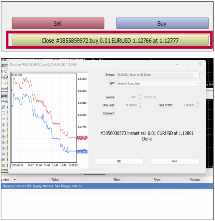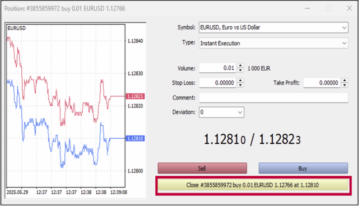 Để hiện thực hóa lợi nhuận từ biến động tỷ giá, bạn cần đóng các vị thế đang mở. Điều này được thực hiện bằng cách thực hiện giao dịch theo hướng ngược lại với giao dịch ban đầu. Ví dụ, nếu giao dịch ban đầu là mua một lot VÀNG, để đóng vị thế cần bán một lot cùng công cụ.