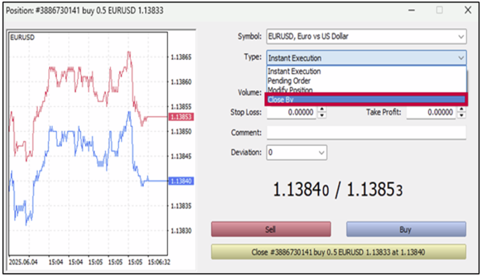 Lệnh “Close By” cho phép bạn đồng thời đóng hai vị trí ngược chiều (cùng ký hiệu, hướng ngược nhau) chỉ với một thao tác. Điều này giúp giảm chi phí spread vì chỉ tính một lần spread.