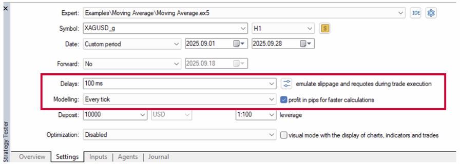 – Chế độ: “Every tick” (chính xác nhất), “1 minute OHLC,” hoặc “Open prices only” (nhanh hơn).