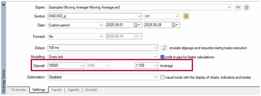 – Nhấp Expert Properties → Testing để cài đặt số dư ban đầu, đòn bẩy và đơn vị tiền tệ kiểm tra.